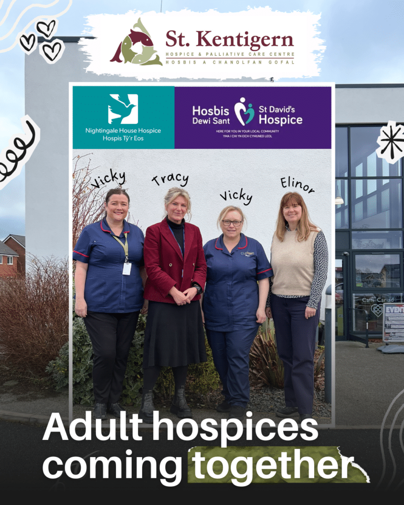 Our Matron, Vicky, welcomed Vicky, Specialist Palliative Care Team Lead from the Health Board, Tracy, Clinical Lead from Nightingale House Hospice, and Elinor, Clinical Lead from St David’s Hospice. The visit provided an opportunity to spend time together within our hospice environment, beginning with a tour of our facilities and followed by open and meaningful conversations about the realities facing adult hospices today.